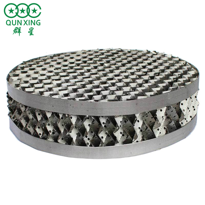 金屬孔板波紋填料:是在金屬薄板表面沖孔,軋制小紋,大波紋較后組裝而成的規(guī)整填料,具有阻力小、氣液分布均勻、效率高、通量大、放大效應(yīng)不明顯等特點,應(yīng)用于負壓、常壓和加壓操作。